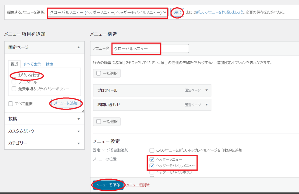 一旦「メニューを作成」をクリックで保存してから、
