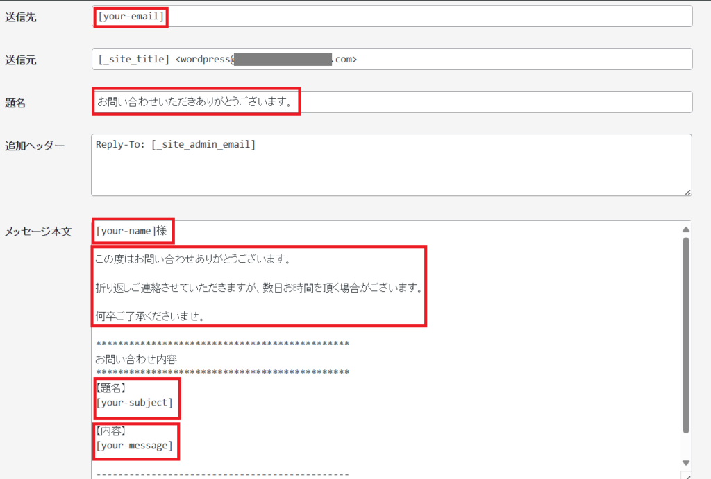 ①『題名』を『お問い合わせいただきありがとうございます。』等に変える。
