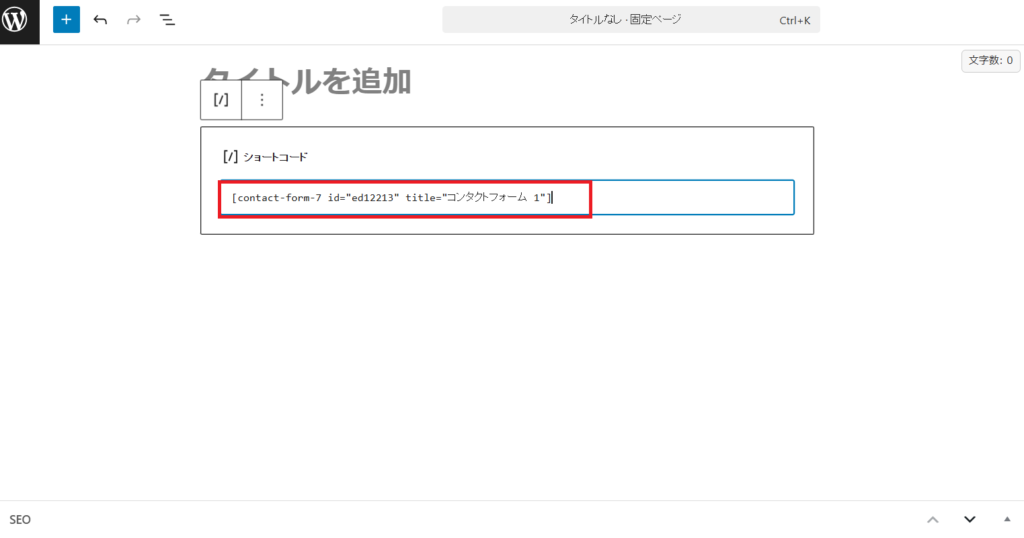 先ほどコピーした「※ショートコード」を貼り付けます。